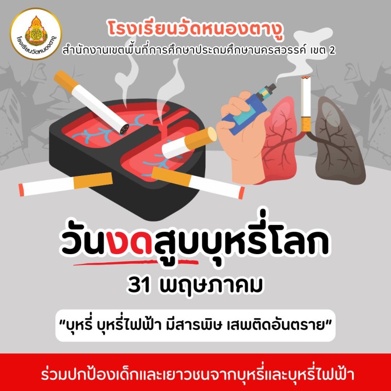 วันที่ 30 เดือน พฤษภาคม พ.ศ. 2568 นำโดย ว่าที่ร้อยตรี ธีระพล เพชรพิพัฒน์ ผู้อำนวยการโรงเรียนวัดหนองตางู พร้อมด้วย นางสาวศิรัญญา แตงน้อย รองผู้อำนวยการโรงเรียน คณะครูและบุคลากรทางการศึกษา ได้จัดกิจกรรม เดินรณรงค์ วันงดสูบบุหรี่โลก เพื่อให้นักเรียนได้ตระหนักถึงโทษและพิษภัยของบุหรี่ บุหรี่ไฟฟ้า พร้อมทั้งส่งเสริมให้นักเรียนมีส่วนร่วมในการทำงานและการเข้าถึงชุมชน |